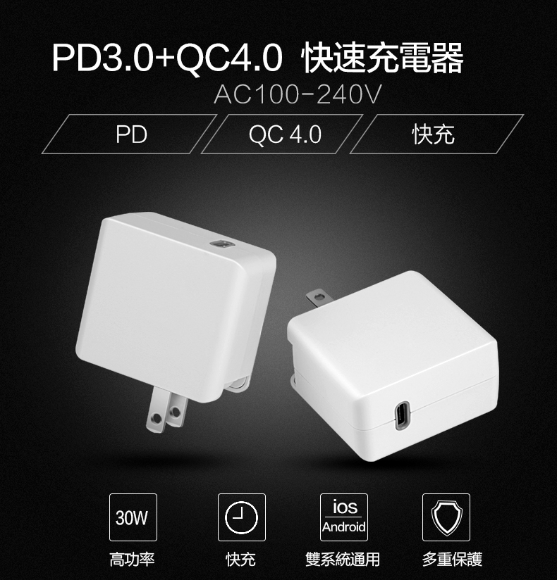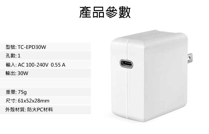 TC-EPD30W USB-C PD 3.0+QC3.0 USB 快速充電器