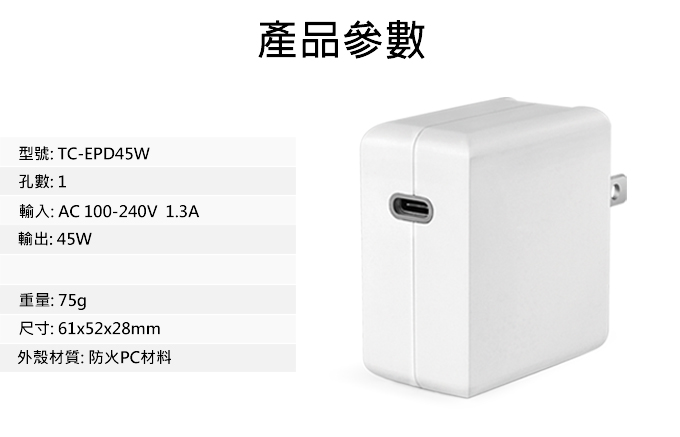 TC-EPD45W Type-C Power Delivery and QC3.0 快速充電器