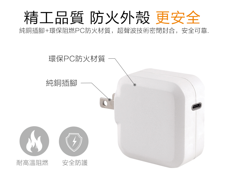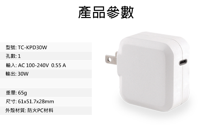 TC-KPD30W便攜式快速充電器由94V0耐火PC材料製成。 確保更安全的長期使用條件。通過國際標準並經過更嚴格的測試,使其更耐用,更安全!