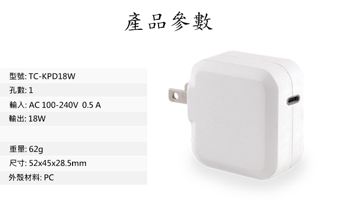 TC-KPD30W USB適配器外形小巧玲瓏,內置USB-C接口PD3.0充電功能USB充電器。 它不僅具有Power Delivery(PD)高科技充電功能,可以快速為您的設備供電,而且還具有優雅的外觀以展現您的氣質。TC-KPD30W不僅是充電器,也是您的特殊配件。