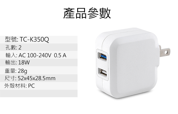 TC-K350Q便攜式USB充電器不僅具有友好的接口設計,使用簡單易用,而且還配有QC3.0高科技和A型USB2.0充電模式。 它是著名品牌手機和平板電腦的USB電源,如移動電源,iPhone,三星,HTC,華碩,華為等設備的USB充電器。