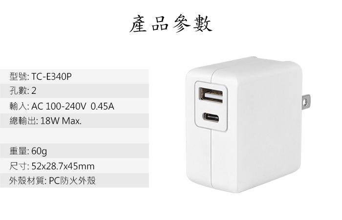 TC-E340P USB充電器經常被使用在為蘋果、三星、HTC、索尼、華碩、LG、OPPO、華為、諾基亞、小米等知名品牌的手機、平板充電,因為它不僅具有一目了然的使用界面,讓使用更簡單方便,而且還配備了高科技的充電功能,讓充電時間縮短,是不可或缺的最佳充電夥伴。