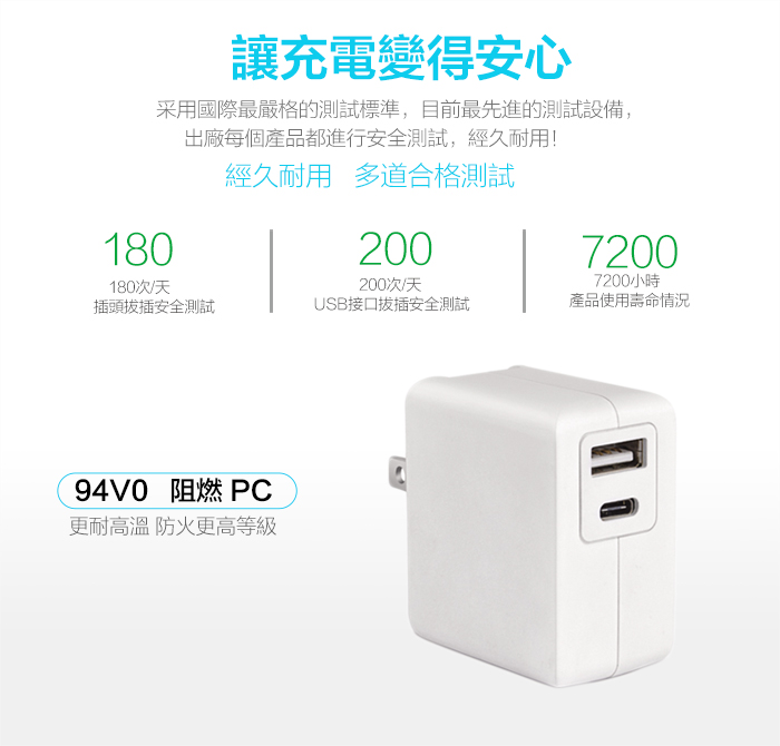 Topcpm的TC-E340P USB充電器嚴選用料,採用94V0 阻燃耐高溫的PC材料製成,並用通過嚴格的國際檢測標準,每個產品製造過程中、出廠前,多道安全測試,確保USB充電器長時間使用能更安全。