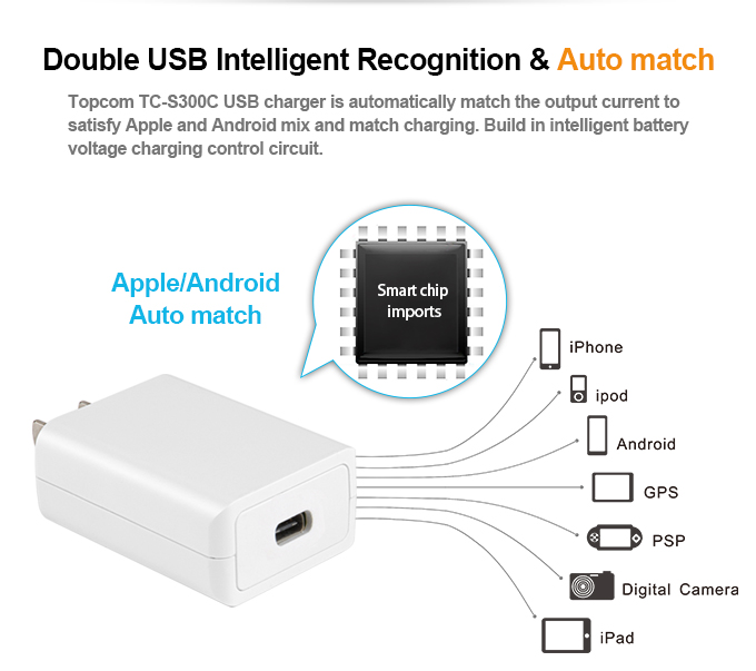 The molds/outlook/circuit of USB charger are all designed by Topcom engineers and built with exclusive high-tech technology.