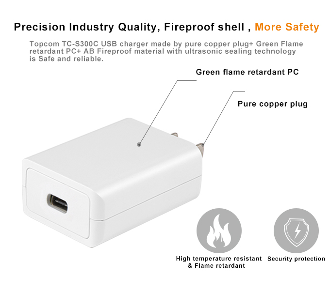 Topcom's TC-S300C quick charger made by the 94V0 fire-resistant PC material. securing a safer long-time usage condition.Pass it by the international standard and to go through more critical test, made it more durable and safer!