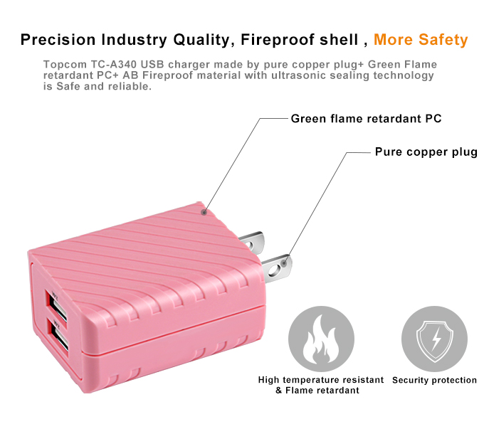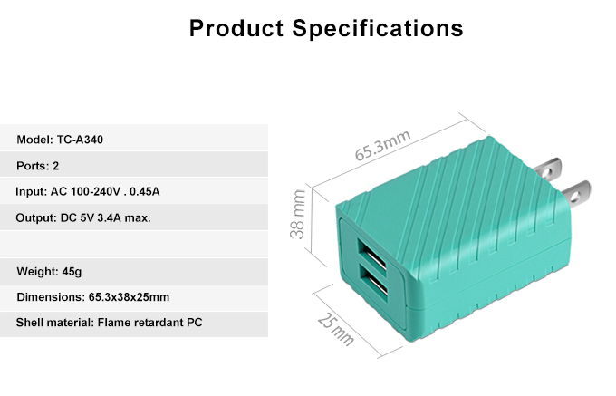 TC-A340 3.4A output USB adapter is small and light, easy to carry with you and storage. Whether you want to go to anywhere or work indoor, it is your best choose.