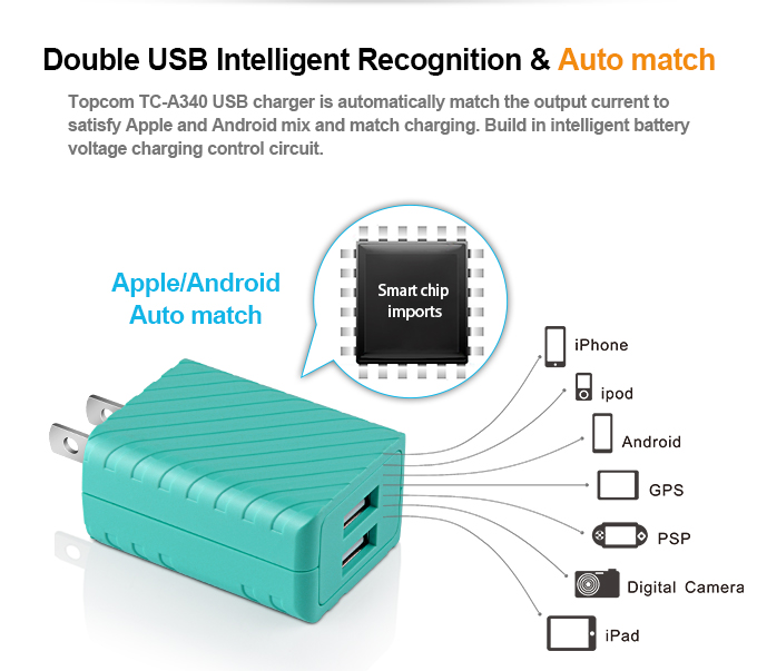 The molds/outlook/circuit of USB charger are all designed by Topcom engineers and built with exclusive high-tech technology.