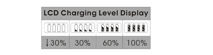 8) Wide LCD display for charging status. The LCD shows the individual capacity of each battery when charging and full charge. The number of segment indicates the capacity of battery power containing.