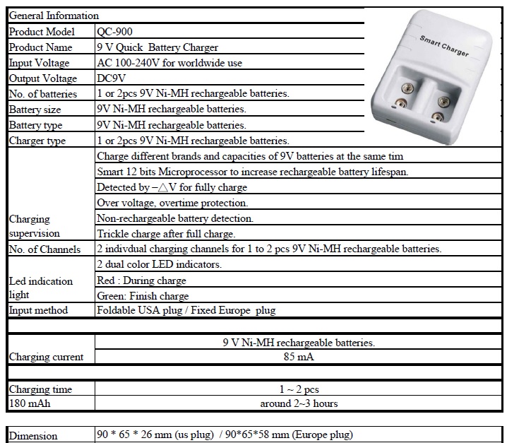 QC-900 9V Ni-MH smart charger can charge 1 or 2pcs of 9V Ni-MH rechargeable batteries. There are 2 dual color LED indicator for the charging status. Built in 12bits of microprocessor to ensure battery is fully charged and to prevent overcharge and increase rechargeable battery lifespan. It is detected by –△V and 0△V for fully charge. The charger also has built-in overtime, overload, and overheat protection. It is efficient and safe!